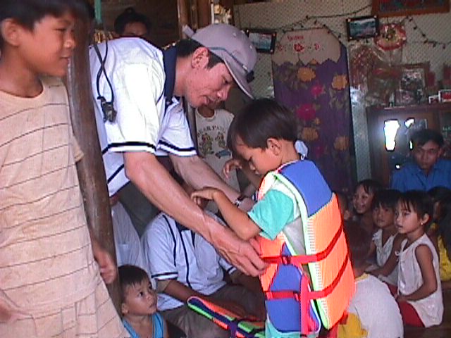 Lũ Lụt Miền Tây - 19.10.2002 -Thành viên hai nhóm hướng dẫn các em mặt áp phao tại điểm giữ trẻ huyện Hồng Ngự |