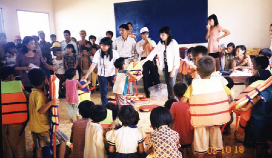 Lũ Lụt Miền Tây - 19.10.2002 -áo phao đối với người dân miền Tây còn khá xa lạ, trẻ em càng không biết áo phao là gì. Thành viên hai nhóm đang trao quà và chỉ vẻ cách sử dụng |